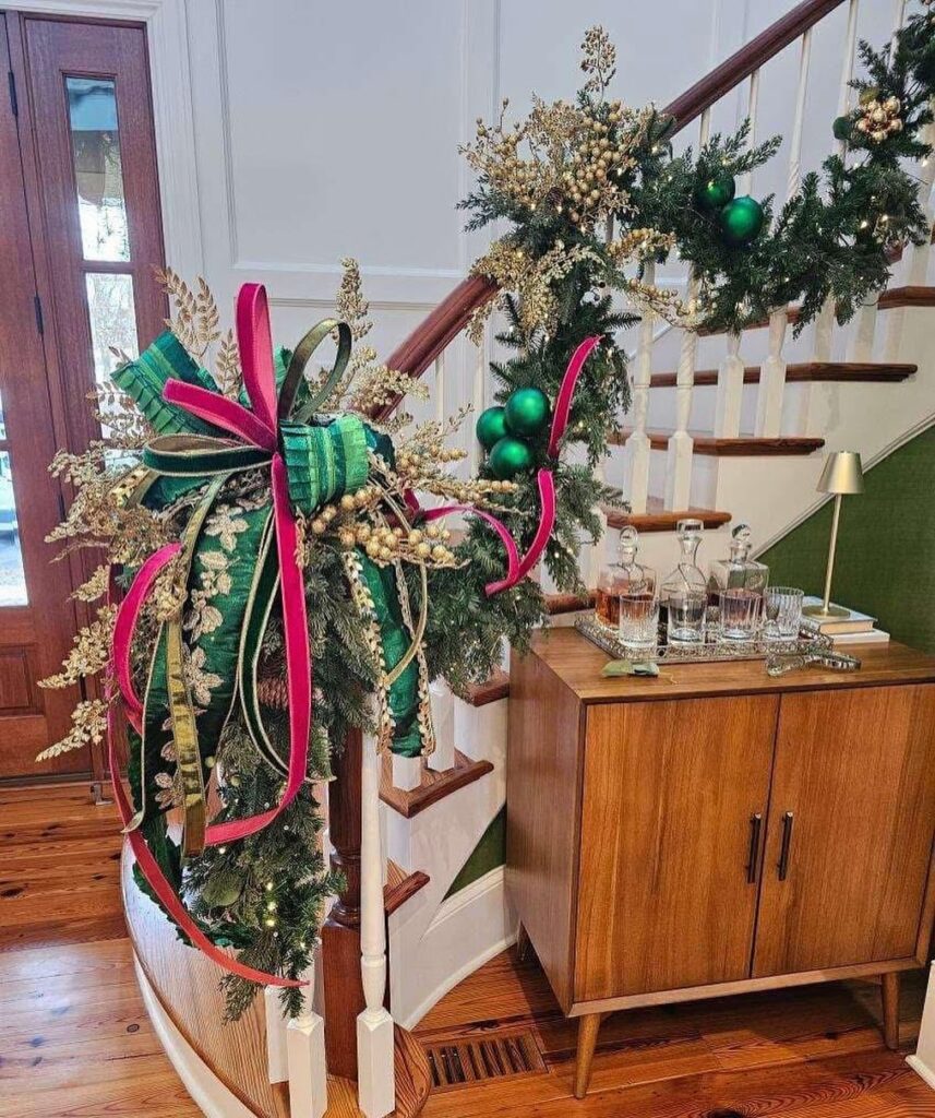 Drape the garland along the railing in a soft swag pattern. Space evenly and secure loosely so it looks natural rather than tight or stiff. Add lights throughout, weaving them so they look built-in. Finish with classic velvet bows on every few swags, or one large bow at the bottom for a statement moment.